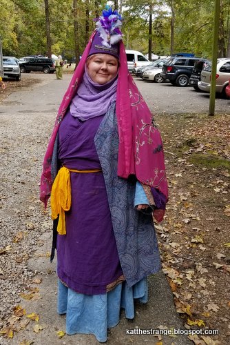 One more - this one from Ork Wars. It was very cold, so I'm wearing several layers here - shift, undercaftan of a heavy cotton-wool that Jac Hatun dyed with indigo, then the del that goes with the outfit featured above (you can barely see the edges), a purple linen del and a blue unlined coat. The matching hat is made with an outer layer made from a scrap of the same purple linen, enhanced with a strip of blue jeweled kundan (Indian wedding jewelry) and a blue and purple plume I made on-site. The underveil is a soft cotton rayon scarf that I plan to hand-hem soon, and the overveil is a rather garish dark fuschia with sequins of flowers and leaves.